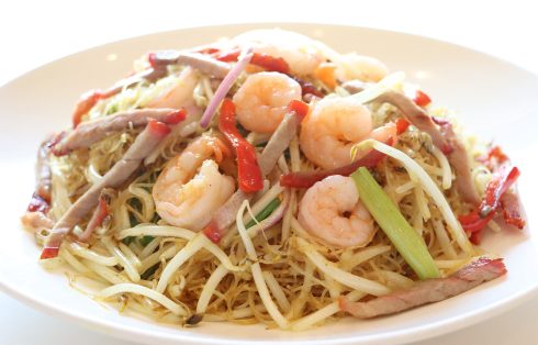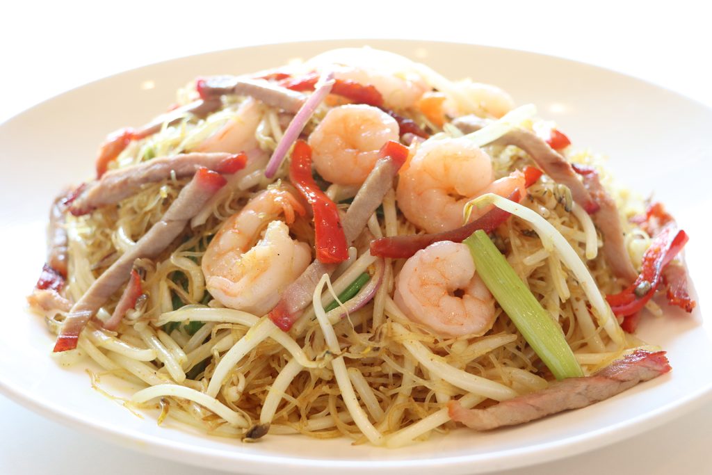 Fried vermicelli with meat & shrimp in curry sauce